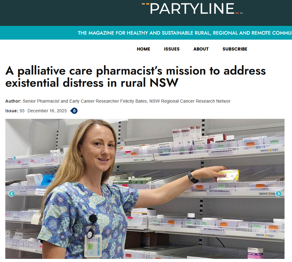We are pleased to share that Mid North Coast Local Health District Senior Palliative Care Pharmacist and NSW Regional Cancer Research Network Clinician Fellow, Felicity Bates, has been featured in Partyline, the online magazine of the National Rural Health Alliance. The Alliance is the peak body advocating for healthy and sustainable rural, regional and remote communities across Australia. Partyline is published quarterly and highlights initiatives and individuals making a meaningful impact on rural health.