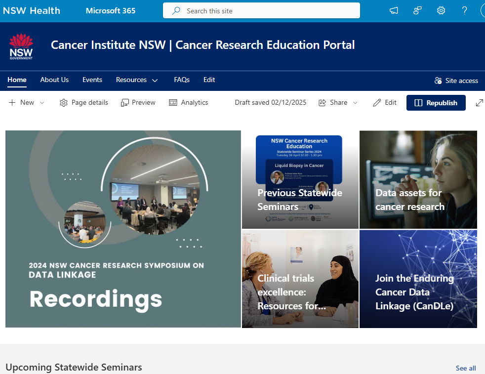 To strengthen cancer research education and foster collaboration across NSW, the Cancer Institute NSW commissioned the development of the Cancer Research Education Portal (CREd Portal) in partnership with three Translational Cancer Research Centres: the NSW Regional Cancer Research Network, Sydney Cancer Partners, and Maridulu Budyari Gumal (SPHERE) Cancer Clinical Academic Group.